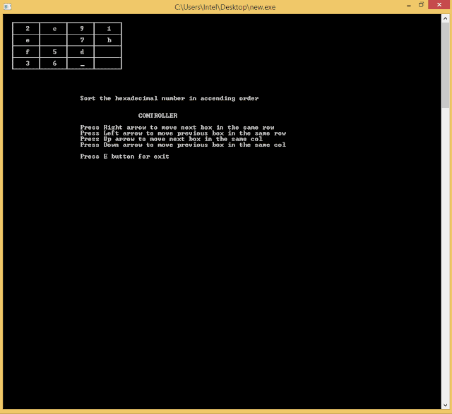 C++ program to crate puzzle game YASH PAL, 31 July 202427 January 2026 In this post, we will write a C++ program to create a puzzle game. In this game we need to press the right arrow to move the next box in the same row, press the left arrow to move the previous box in the same row, press up arrow to move next box in the same column and press down arrow to move the previous box in the same column. To exist in the game we need to press the E button. To win the game we need to sort the hexadecimal number in ascending order.C++ program to crate puzzle game.#include<iostream> #include<conio.h> #include<windows.h> BOOL gotoxy(const WORD x, const WORD y) { COORD xy; xy.X = x; xy.Y = y; return SetConsoleCursorPosition(GetStdHandle(STD_OUTPUT_HANDLE), xy); } int main() { char a[17] = {' ','c','a','9','1','2','7','b','4','e','5','d','8','f','3','6'}; int i,j,k,l,temp; char ch,ch1,ch2,ch3,ch4,ch5,ch6,ch7,ch8,ch9,ch10; char cho = 15; system("cls"); a[16] = 255; system("cls"); ch = 179; ch1 = 196; ch2 = 197; ch3 = 194; ch4 = 193; ch5 = 218; ch6 = 191; ch7 = 192; ch8 = 217; ch9 = 195; ch10 = 180; gotoxy(2,1); std::cout<<ch5; gotoxy(30,1); std::cout<<ch6; gotoxy(2,9); std::cout<<ch7; gotoxy(30,9); std::cout<<ch8; for(i=2;i<=30;i+=7) for(j=2;j<=8;j++) { gotoxy(i,j); std::cout<<ch; } for(k=1;k<=27;k+=1) for(l=1;l<=9;l+=2) { gotoxy(k+2,l); std::cout<<ch1; } for(i=2;i<=21;i+=7) for(j=1;j<=7;j+=2) { gotoxy(i+7,j+2); std::cout<<ch2; } for(i=2;i<=22;i+=7) { gotoxy(i+7,1); std::cout<<ch3; } for(i=2;i<=21;i+=7) { gotoxy(i+7,9); std::cout<<ch4; } for(i=2;i<=7;i+=2) { gotoxy(2,i+1); std::cout<<ch9; } for(i=2;i<=7;i+=2) { gotoxy(30,i+1); std::cout<<ch10; } gotoxy(20,14); std::cout<<"Sort the hexadecimal number in accending order"<<std::endl; gotoxy(35,17); std::cout<<"CONTROLLER"<<std::endl; gotoxy(20,19); std::cout<<"Press Right arrow to move next box in the same row"<<std::endl; gotoxy(20,20); std::cout<<"Press Left arrow to move previous box in the same row"<<std::endl; gotoxy(20,21); std::cout<<"Press Up arrow to move next box in the same col"<<std::endl; gotoxy(20,22); std::cout<<"Press Down arrow to move previous box in the same col"<<std::endl; gotoxy(20,24); std::cout<<"Press E button for exit"<<std::endl; int p = 1; for(i=1;i<=28;i+=7) { gotoxy(5+i,2); std::cout<<a[p]; p++; } for(i=1;i<28;i+=7) { gotoxy(5+i,4); std::cout<<a[p]; p++; } for(i=1;i<28;i+=7) { gotoxy(5+i,6); std::cout<<a[p]; p++; } for(i=1;i<21;i+=7) { gotoxy(5+i,8); std::cout<<a[p]; p++; } i = 27; j = 8; while(cho != 101) { if(cho == 'M') { if(i>21) i=i+0; else { i = i+7; temp = a[p]; a[p] = a[p+1]; a[p+1] = temp; gotoxy(i,j); std::cout<<a[p+1]; gotoxy(i-7,j); std::cout<<a[p]; p++; } } gotoxy(i,j); if(cho=='K') { if(k<7) i = i-0; else { i = i-7; temp = a[p]; a[p] = a[p-1]; a[p-1] = temp; gotoxy(i+7,j); std::cout<<a[p]; gotoxy(i,j); std::cout<<a[p-1]; p--; } } if(cho=='H') { if(j<3) j = j-0; else { j = j-2; temp = a[p]; a[p-4] = temp; gotoxy(i,j+2); std::cout<<a[p]; gotoxy(i,j); std::cout<<a[p-4]; p-=4; } } if(cho=='P') { if(j>6) j = j+0; else { j = j+2; temp = a[p]; a[p] = a[p+4]; a[p+4] = temp; gotoxy(i,j-2); std::cout<<a[p]; gotoxy(i,j); std::cout<<a[p+4]; p+=4; } } cho = getch(); } return 0; } Output C++ Programming Tutorials coding problems solutions Programs